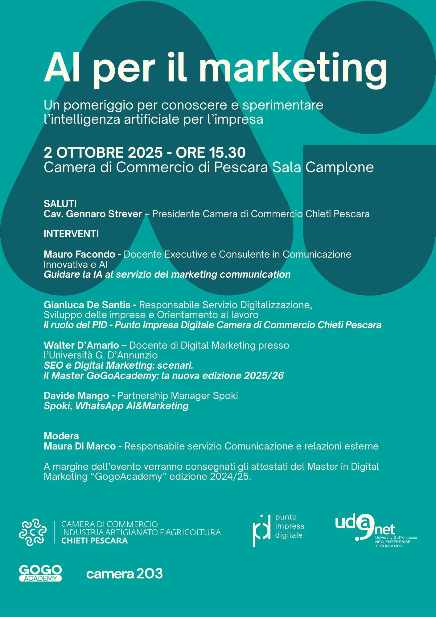 Giovedì 2 ottobre alle ore 15:30 nella Sala Camplone della Camera di Commercio Chieti Pescara (Via Conte di Ruvo 2 – Pescara) si terrà un seminario dal titolo: “AI – Intelligenza Artificiale per il marketing”.