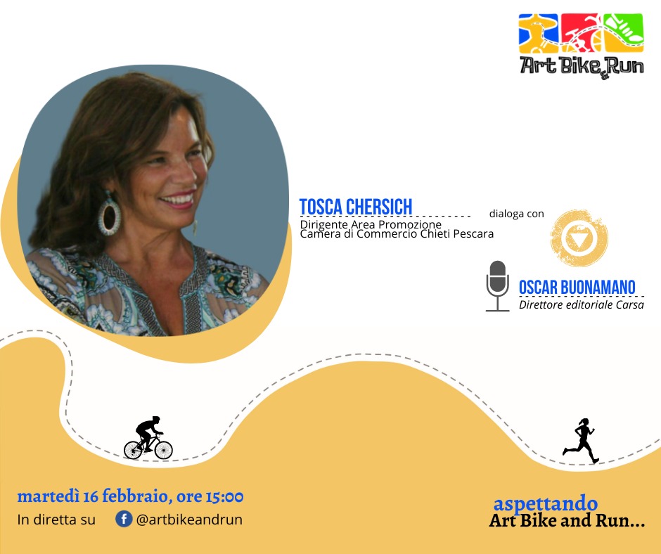 Segui la scia dell’evento con le dirette sul profilo Facebook di Art Bike and Run: la prossima, martedì 16 febbraio alle ore 15:00, vedrà come protagonista Tosca Chersich, dirigente dell’Area Promozione della Camera di Commercio Chieti Pescara.