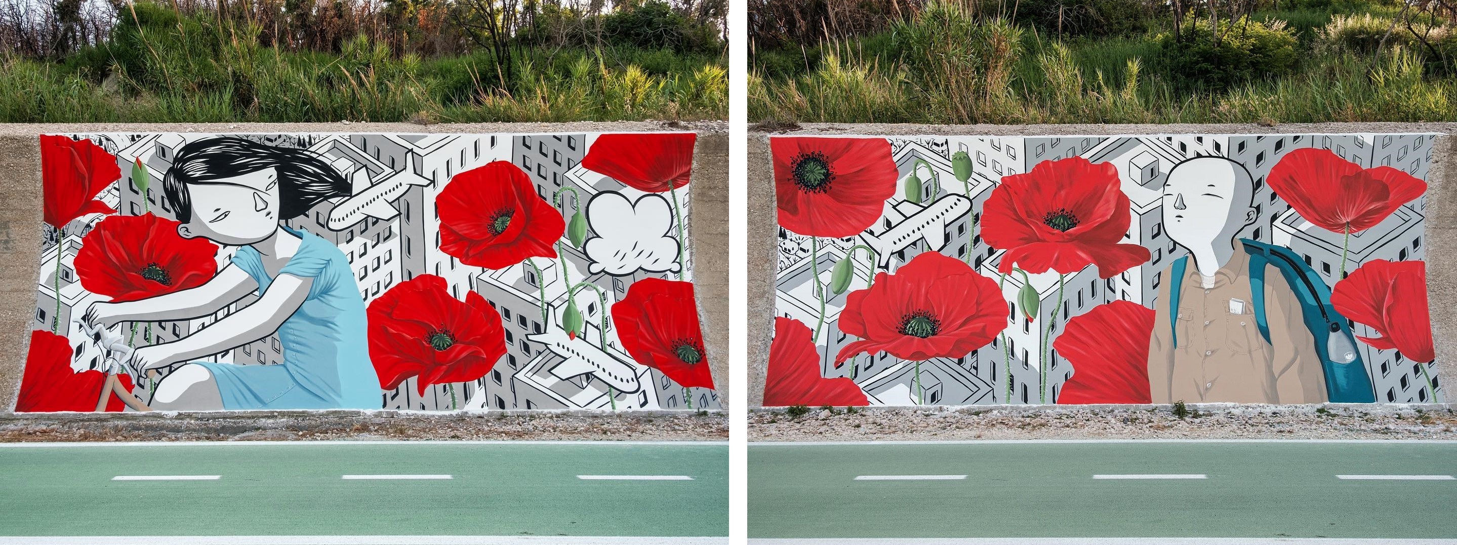 Per il secondo murale invece mi sono concentrato sul ruolo delle donne partigiane in particolare delle staffette, loro usavano accompagnare le brigate e mostrare loro le vie più sicure, esploravano i luoghi da attraversare e raccoglievano le informazioni, specie dopo i rastrellamenti. I miei personaggi sono circondati da campi di papaveri, fiore simbolo dei Partigiani, ho voluto che fossero loro il simbolo del mio tributo e allo stesso tempo un invito a visitare questo bellissimo pezzo di terra».