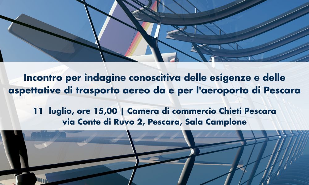 A tal fine, la Giunta regionale e la Camera di commercio Chieti Pescara, convocano un incontro, giovedì 11 luglio alle ore 15 in Camera di commercio, a Pescara (Sala Camplone) per effettuare una indagine conoscitiva delle esigenze e delle aspettative di trasporto aereo da e per l’aeroporto di Pescara necessaria all’individuazione di possibili oneri di servizio pubblico (OSP) per la continuità territoriale dell’Abruzzo.