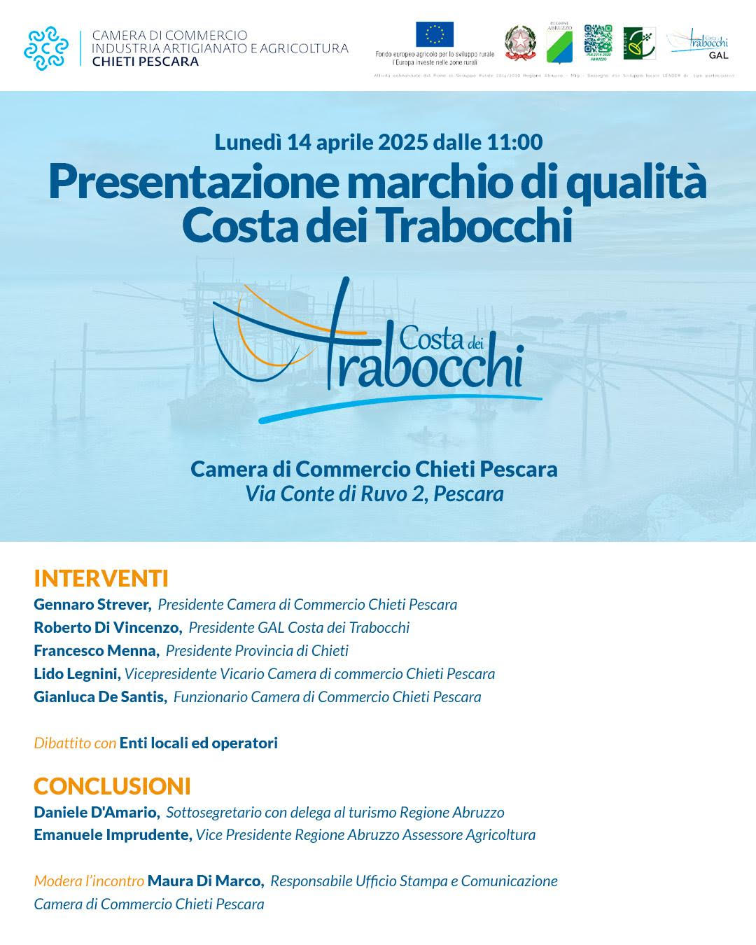 Lunedì 14 aprile alle ore 11:00, nella sala Camplone della sede di Pescara della Camera di commercio Chieti Pescara, in via Conte di Ruvo 2, si terrà la presentazione del progetto Marchio Costa dei Trabocchi.