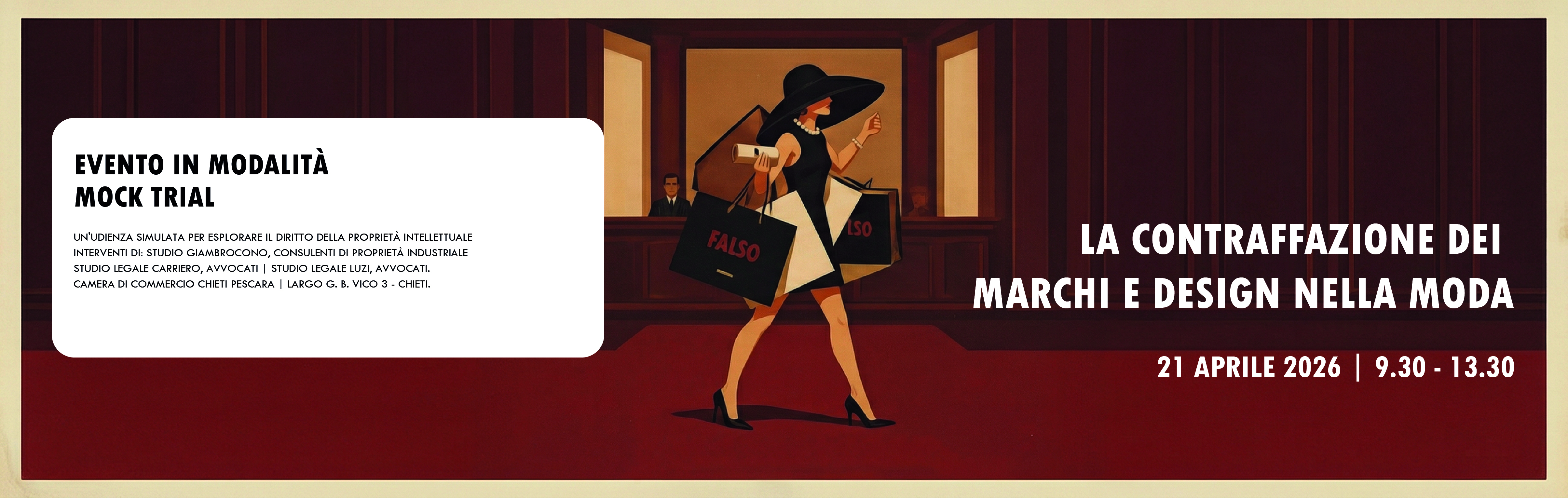 L’evento, che potrà essere seguito anche da remoto con apposito collegamento web, si terrà il prossimo 21 aprile 2026 e consisterà nella rappresentazione veritiera di un processo per contraffazione con tanto di Giudice monocratico che dovrà emettere una sentenza basata su un contraddittorio tra due imprese che si contrappongono in un processo civile per contraffazione, rappresentate ciascuna da un Consulente, perito di parte, e da un avvocato difensore.