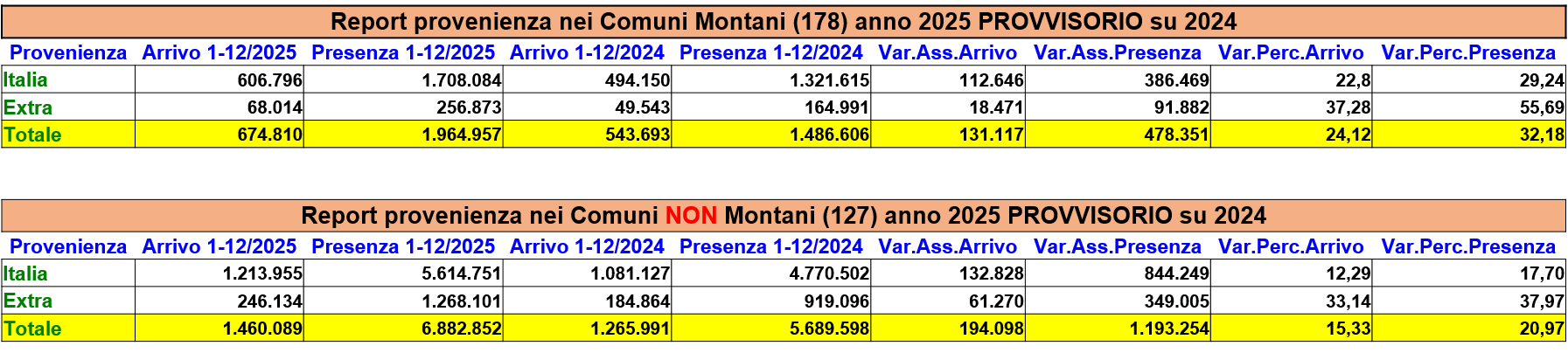 Nota: si osserva anche un lieve allungamento della permanenza media: circa 2,9 notti nei Comuni montani e 4,7 notti nei non montani (in aumento rispetto al 2024).