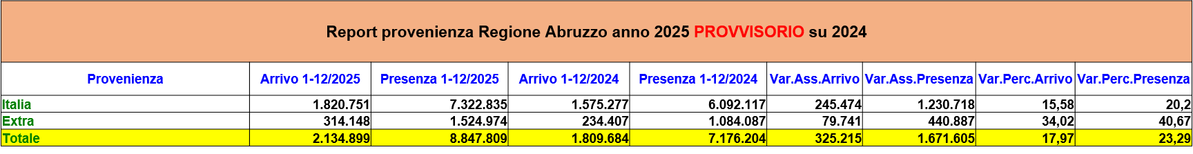 L’Abruzzo registra un andamento estremamente positivo del turismo nel periodo gennaio–dicembre 2025.